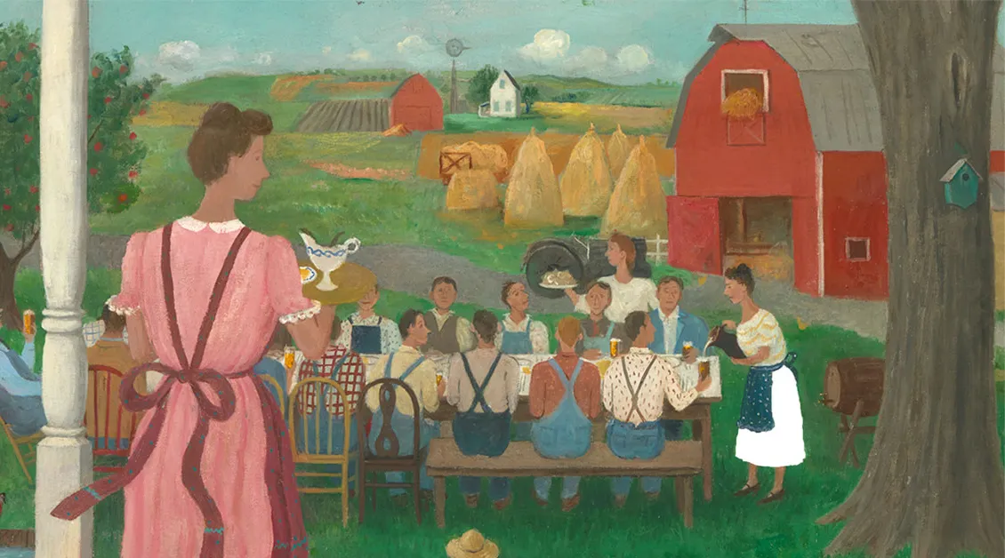 Beer Belongs キャンペーンの Doris Lee による Harvest Time。 (スミソニアン アメリカ美術館 ジェームス F. ディッケ家寄贈)当時の著名な芸術家から依頼されたアートが、ビール ビロングスの広告の最初のシリーズの中心でした。これらの著名なアーティストには、ルシール・コーコス、ドリス・リー、ジュリアン・ビンフォード、マリアンヌ・アペル、フレッチャー・マーティン、ウィリアム・パーマーなどが含まれます。彼らのスタイルは、現代原始主義から社会的写実主義に至るまで多岐にわたり、さまざまな絵画技法が含まれていました。ドリス・リーの「ハーベスト・タイム」は現在、スミソニアン博物館のレイノルズ・センター・フォー・アメリカン・アートに展示されています。これは、これらの作品が広告アートを超えて美術館や個人コレクションに収められたことを示す作品の 1 つです。