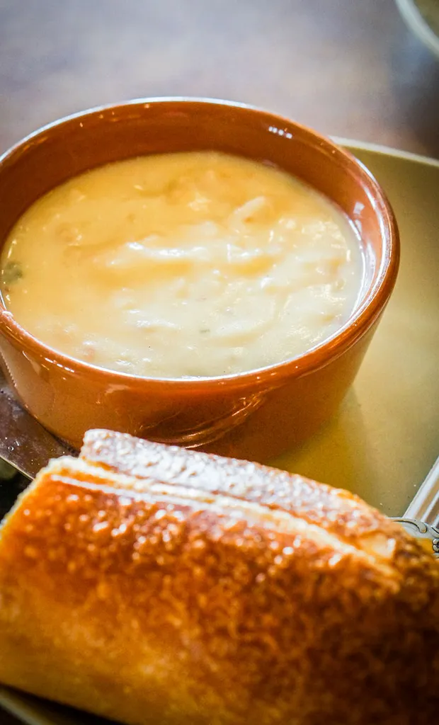 DC Brau の The Corruption India ペールエールで作られたこの IPA ビール チーズ スープは、ホップが好きな人には向きません。スパイシーなポップコーン クルトン ベーコンやチーズに合うものなど、さまざまなトッピングを加えてみてください。
