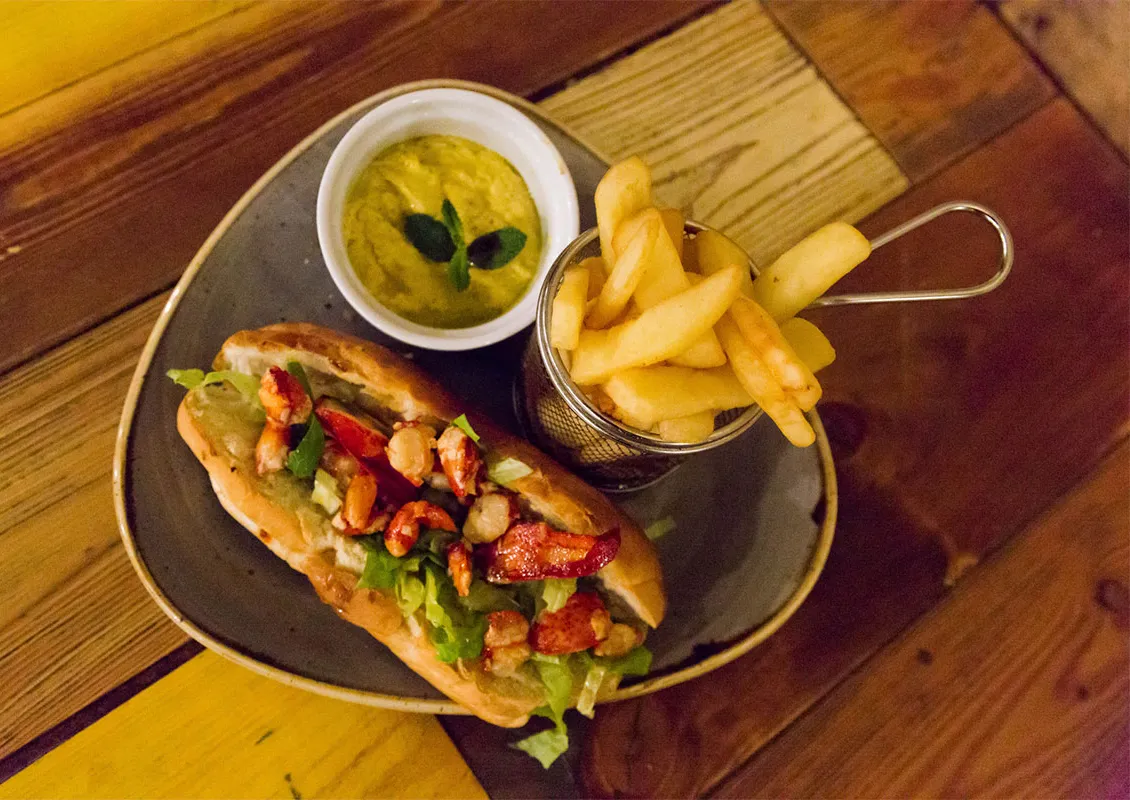 バック フォーティ ビール社のトラック ストップ ハニー ブラウン エールで作ったブラウン エール ポーチド ヴィダリア オニオンとハニー ロブスターの天ぷらポーボーイ。